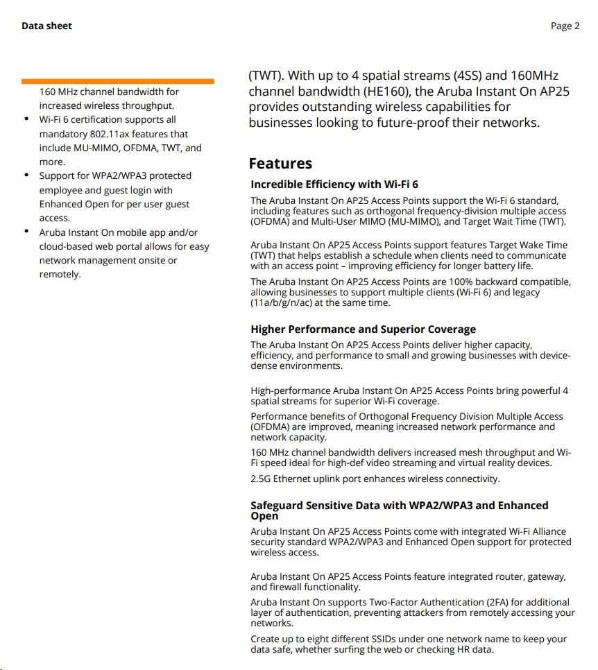 The HPE Networking Instant On Wi-Fi 6 Access Points portfolio is designed to meet the increasing volume of connected devices that face small businesses. Our range of Wi-Fi Certified 6 access points delivers superior performance, coverage, and speed at a competitive price that is perfect for small and growing businesses.