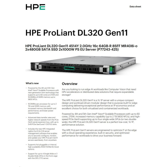 Model Name HPE PL DL320g11 4514Y (2.0/16C/4400) 2x32G 2x480G SATA SSD MR408i-o 8SFFBCU3 2x1000W 2x1Gb 1U EIR