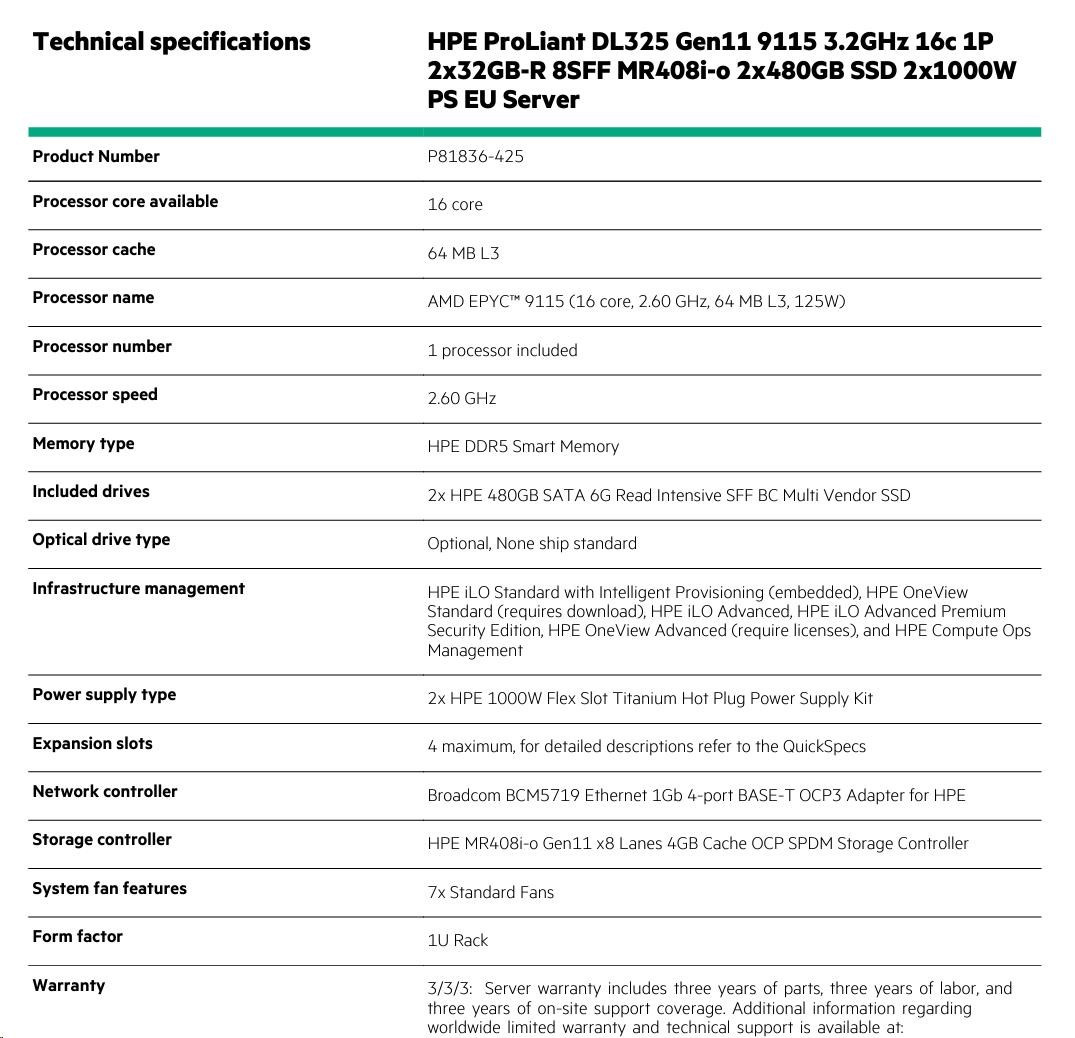 HPE PL DL325g11 AMD Epyc 9115 (2.6/16C) 2x32G (P64985) 2x480G 2x1000W MR408i-o/4G 8SFF 4p1Gocp Smart Choice
