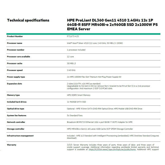 | Model Name | HPE ProLiant DL360 Gen11 4510 2.4GHz 12c 1P 64GB-R 8SFF MR408i-o 2x960GB SSD 2x1000W PS EMEA Server |