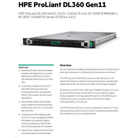 Model Name HPE PL DL360g11 5515+ (3.2/8C/165W) 1x32G MR408i-o/4G 8-10SFF 1x1000W 2x10G-T NBD333 1U