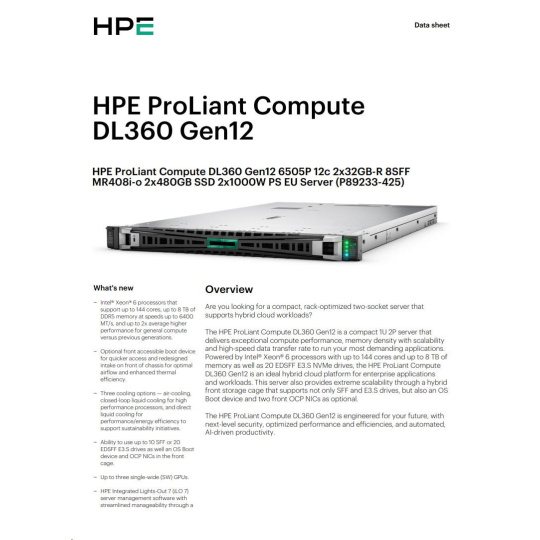HPE PL DL360g12 6505P (2.2G/12C) 2x32G (P69727) 2x2.4TB MR408i-o 8SFF 2x1000W 2p10GbE NBD333 Smart Choice.