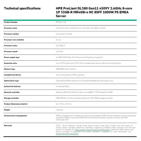 3/3/3: Server Warranty includes three years of parts, three years of labor, and three years of onsite support coverage. Additional information regarding worldwide limited warranty and technical support is available at: https://support.hpe.com/hpsc/wc/public/home. Additional HPE support and service coverage, to supplement the product warranty, is available. For more information, visit https://www.hpe.com/support.