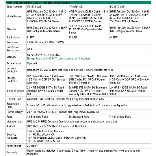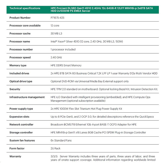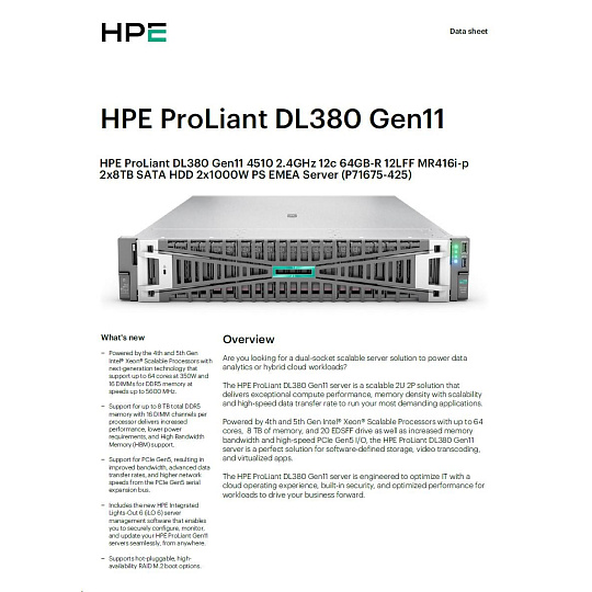 HPE PL DL380g11 4510 (2.4/12C) 2x32G (P64706) 2x8TB (834028) 2x1000W MR416i-p 12LFF ocp4x1Gb Smart Choice