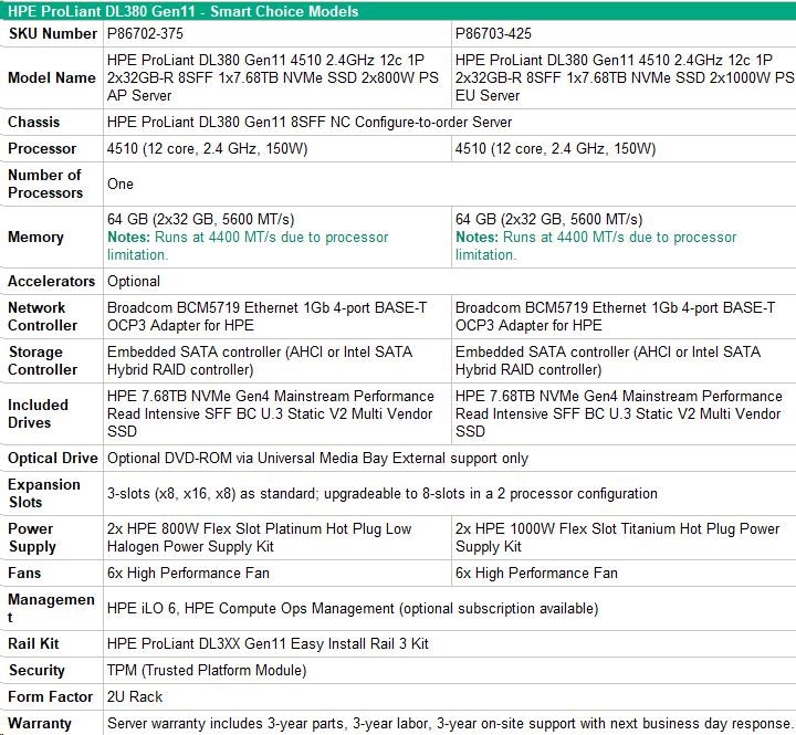 HPE PL DL380g11 4510 (2.4G/12C) 2x32G (p64706) 1x7.68TB NVMe 2x1000W 8SFF 4p1G Smart Choice.