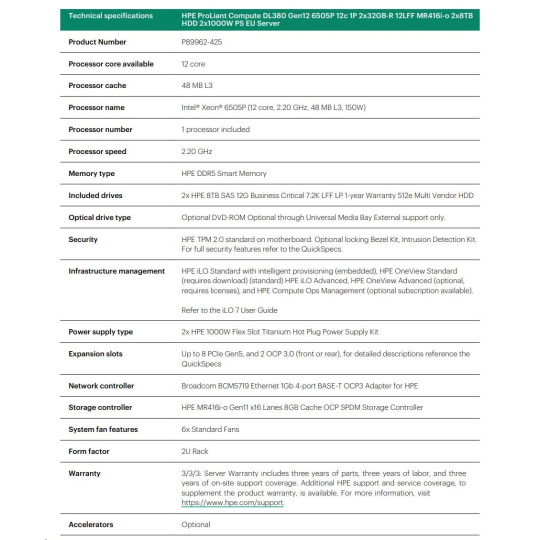 HPE PL DL380g12 6505P (2.2/12C) 2x32G (P69727) 2x8TB MR416i-o 2x1000W 10GbE NBD333 Smart Choice.