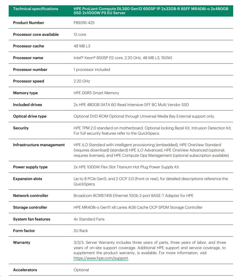 HPE PL DL380g12 6505P (2.2/12C) 2x32G (P69727) 2x8TB MR416i-o 2x1000W 10GbE NBD333 Smart Choice.