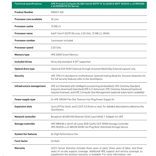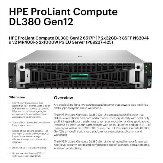 HPE PL DL380g12 6517P (3.2-4.2G/16C) 4x32G (P69727) 8SFF NS204i-uv2 MR408i-o 2x1000W 2p10T NBD333 Smart Choice