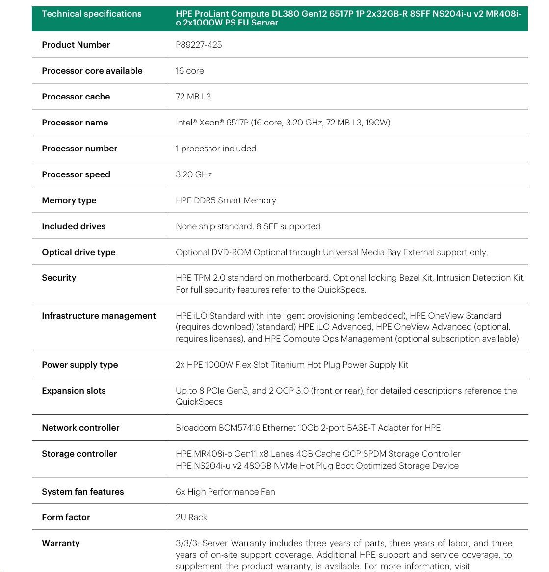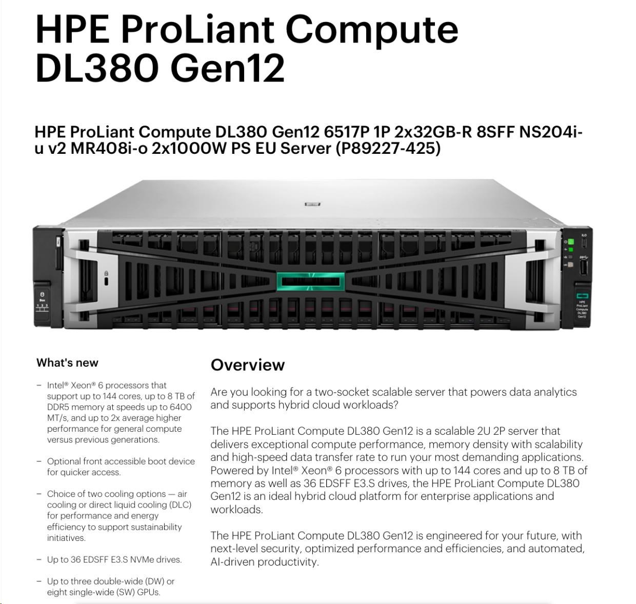 HPE PL DL380g12 6517P (3.2-4.2G/16C) 4x32G (P69727) 8SFF NS204i-uv2 MR408i-o 2x1000W 2p10T NBD333 Smart Choice