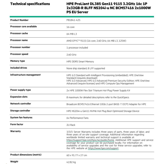 Technical specifications HPE ProLiant DL385 Gen11 9115 2.6G 16c 1P 2x32GB-R 8LFF NS204i-u NC BCM57416 2x1000W PS EU
