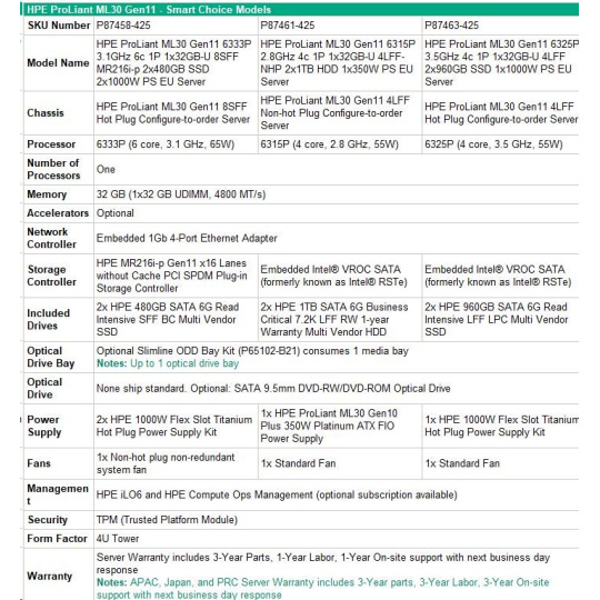 HPE PL ML30g11 6315P (2.8-5.2G/4C4T) 1x32G 2x1TB SATA 4LFF-NHP 1x350 VROC 4p1G NBD311 Smart Choice.