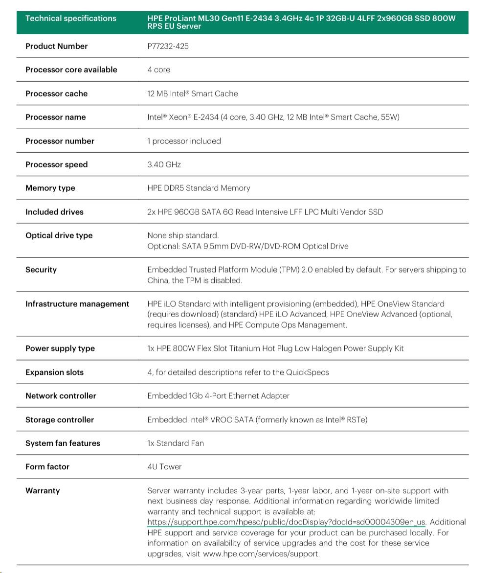 Model Name | HPE ProLiant ML30 Gen11 E-2434 3.4GHz 4c 1P 32GB-U 4LFF 2x960GB SSD 800W RPS EU Server |