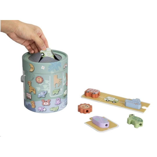 Balenie obsahuje: kyblík, 20 drevených predmetov v podobe očíslovaných zvieratiek, ovocia, dopravných prostriedkov a motívov z oblohy, 20 hracích kartičiek v podobe puzzle, 2 provázky na navliekanie.