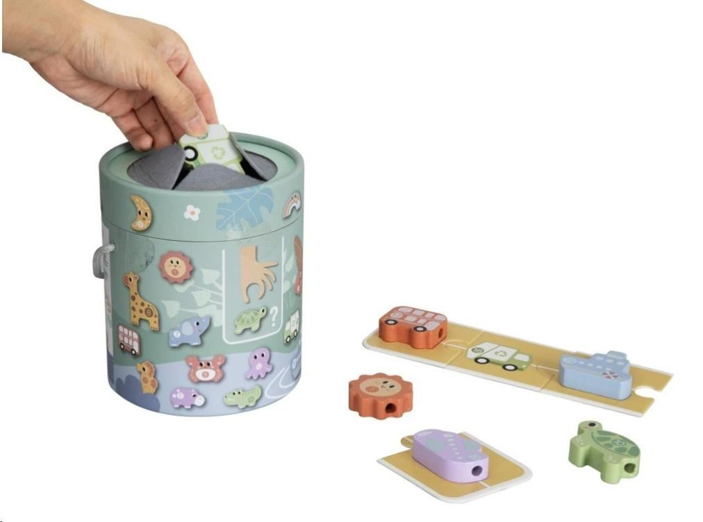 Balenie obsahuje: kyblík, 20 drevených predmetov v podobe očíslovaných zvieratiek, ovocia, dopravných prostriedkov a motívov z oblohy, 20 hracích kartičiek v podobe puzzle, 2 provázky na navliekanie.