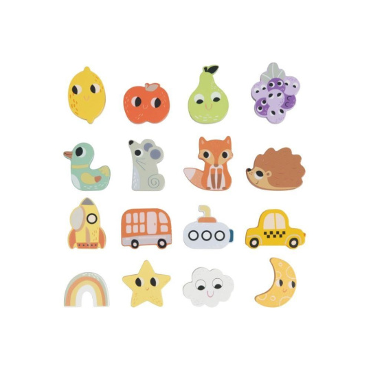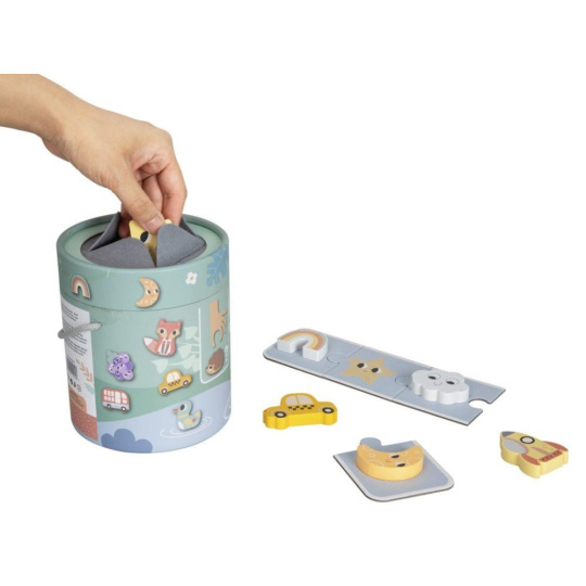 Spoločenská hra pre Deti aj celú rodinu Hmatej a nájdi ponúka veľa zábavy a možností na hranie. Hra, ktorá dokonale potrénuje a zdokonalí motorické zručnosti, spočíva v hľadaní správneho dreveného predmetu v kyblíku, keď musí hráč nájsť požadovaný tvar iba hmatom. Hru môžete hrať rôznymi spôsobmi a prispôsobiť ju veku i zručnostiam každého hráča. Užite si spoločné chvíle pri hmataní a hľadaní zvieratiek, dopravných prostriedkov a ďalších tvarov.