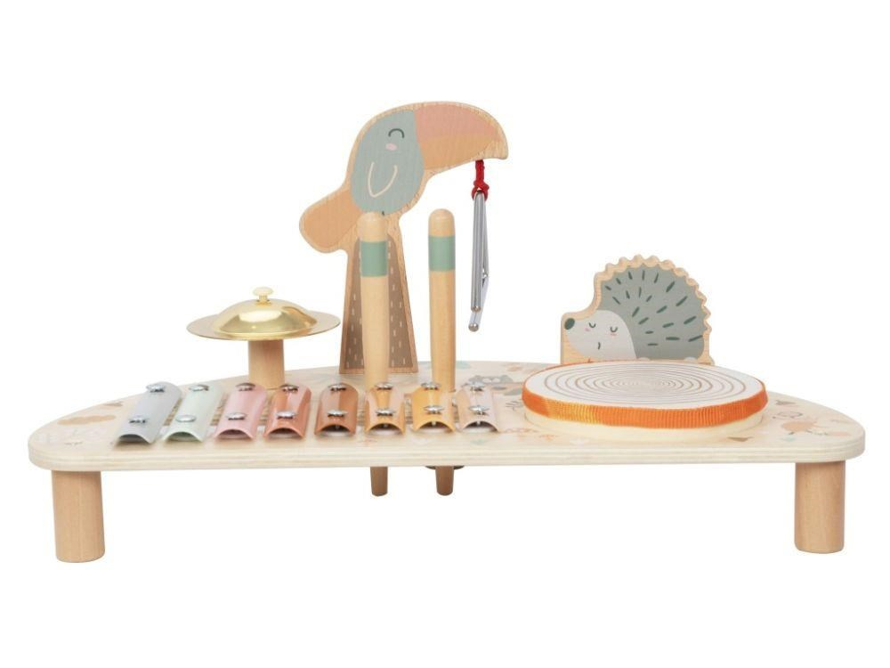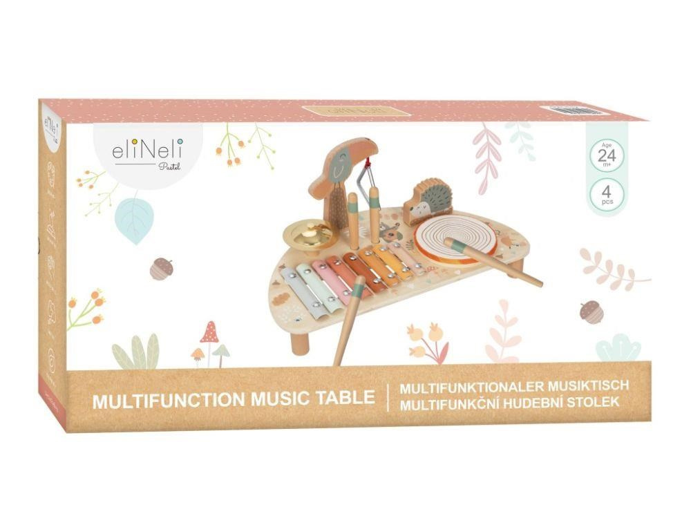 Drevený hudobný stolček pre deti so sadou 5 hudobných nástrojov na jednom mieste, s krásnou maľbou a so zvieratkami z lesa, prebudí lásku k hudbe v každom dieťati. Hudobný stolček obsahuje základné detské hudobné nástroje, ktoré stimulujú zmysly, zdokonaľujú jemnú motoriku, oboznámi deti s tým, aké zvuky ktorý nástroj vydáva, ako sa naň hraje.