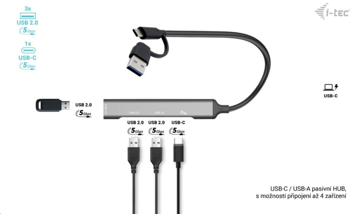 - Univerzálny pasívny HUB USB-C/USB-A umožňuje pripojiť až 4 zariadenia.
