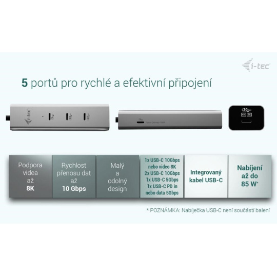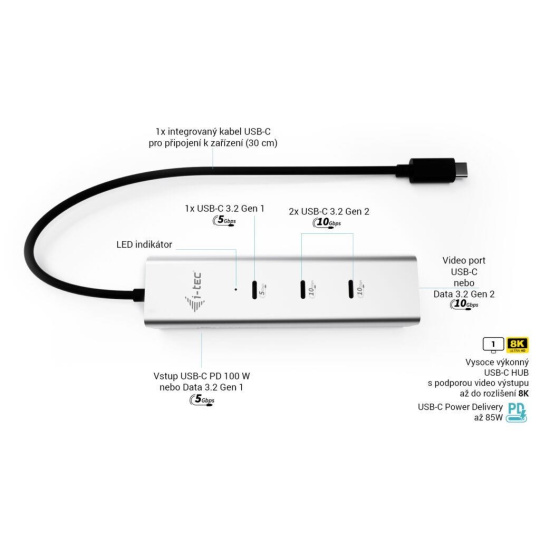 i-tec USB-C Charging Metal HUB 5port s USB-C video 8K + Power Delivery 85W