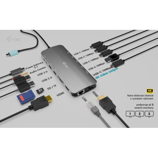i-tec USB-C Metal Nano 3x Display Dock, 2x HDMI 1x USB-C video,PD 140W + Universal Charger 140 W