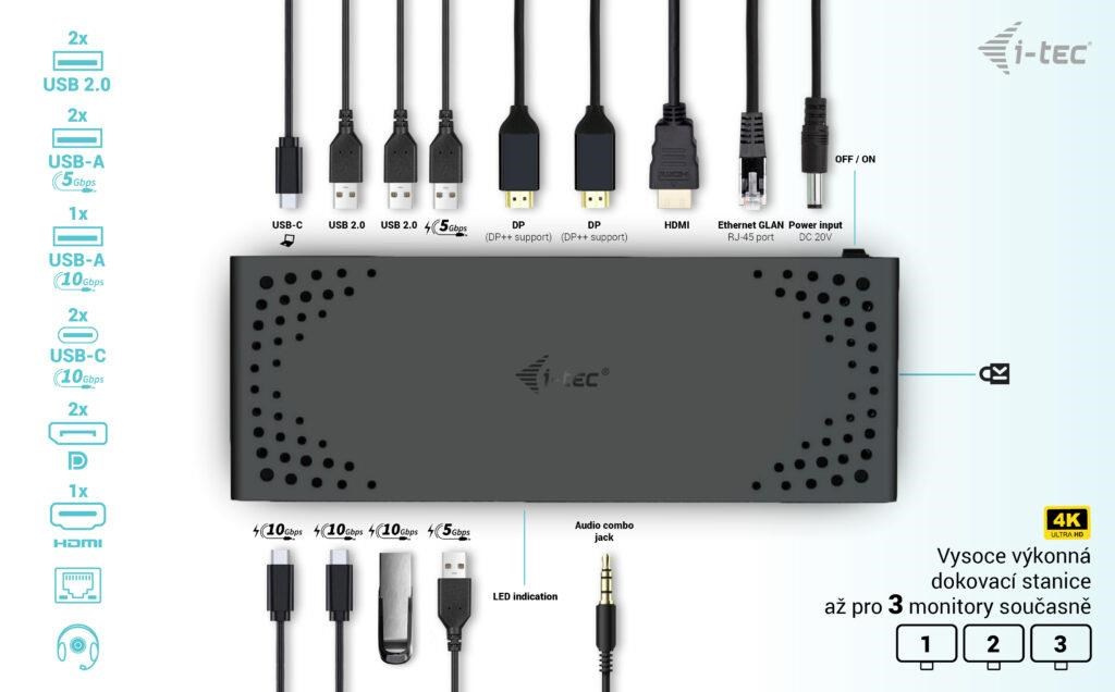 - Voliteľné klonovanie MAC adries a automatické zálohovanie dát pripojeného počítača (pri použití softvéru i-tec Docker Pro).