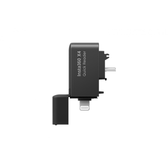 Rýchla čítačka kariet pre kameru Insta360 X4. Čítačka slúži na rýchle stiahnutie súborov z karty v kamere Insta360 X4 a následné nahranie súborov do telefónu. Konektor Lightning/USB-C. Váha: 12,5 g Rozmery: 46 x 14 x 31 mm