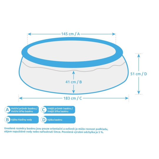 Uvedené rozmery bazénu sú iba orientačné a ovplyvniť ich môže rovnosť podkladu, objem napustenej vody alebo nafúknutie límca. Povolená výrobná odchýlka je 5 %.