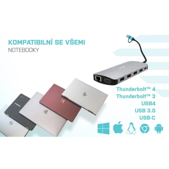 - Dokovacia stanica je kompatibilná s takmer akýmkoľvek súčasným notebookom (pripojenie cez porty USB 3.0, USB-C, USB4 alebo Thunderbolt™ 3/4).
