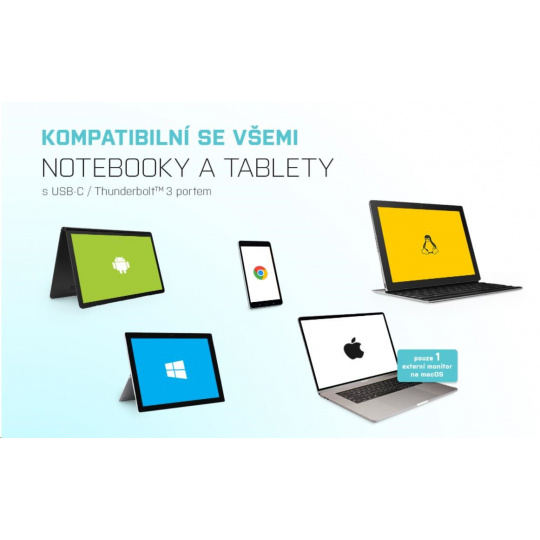 Táto dokovacia stanica je navrhnutá na použitie s akýmkoľvek notebookom, tabletom alebo smartfónom bez ohľadu na typ, značku alebo operačný systém. Potrebujete len voľný port Thunderbolt 3 alebo USB-C, ktorý dokáže prenášať videosignál.