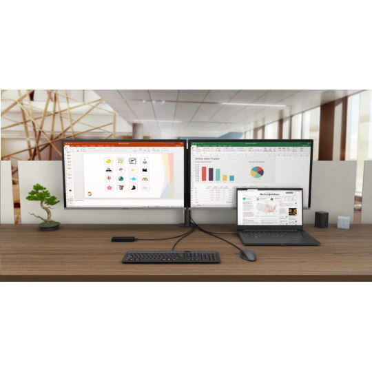Kancelárska dokovacia stanica USB-C, ktorá podporuje až 2× externý monitor s rozlíšením 4K. Stanica je kompatibilná s akýmkoľvek notebookom vybaveným portom USB-C alebo Thunderbolt 3. 6x port USB, spoľahlivé a rýchle pripojenie k firemnej sieti vďaka integrovanému portu LAN, napájanie až do 100 W a podpora inštalácie za monitor, to všetko robí z tejto dokovacej stanice ideálneho spoločníka pre profesionálov.
