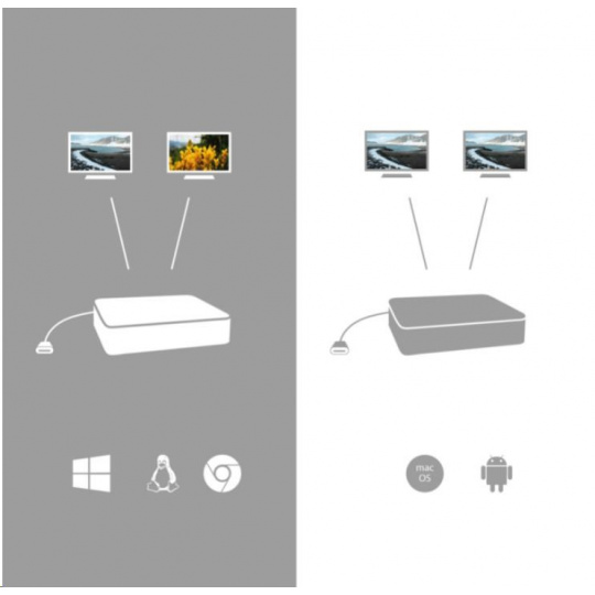 * Operačný systém macOS nepodporuje technológiu Multi Stream Transport (MST), čo znamená, že po pripojení k systému macOS sa na oboch pripojených monitoroch bude premietať rovnaký obraz.
