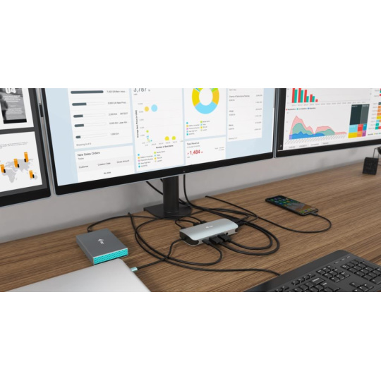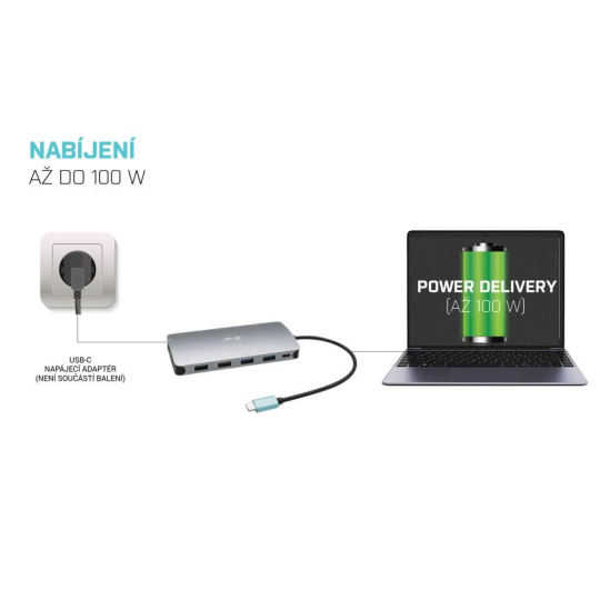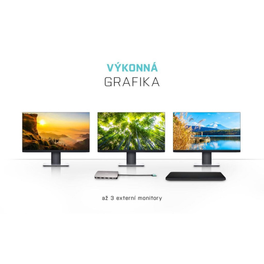 Malá kovová dokovacia stanica USB-C, ku ktorej možno pripojiť až tri externé monitory*. Stačí pripojiť notebook alebo tablet (bez potreby ovládačov) a využiť rýchle dátové pripojenie USB, pripojenie k internetu cez port LAN a možnosť pripojiť slúchadlá a mikrofón. Samozrejme, podporuje napájanie notebooku až do 100 W, čo znamená, že budete môcť nabíjať všetky notebooky a tablety, ktoré podporujú nabíjanie cez USB-C (USB-C Power Delivery).