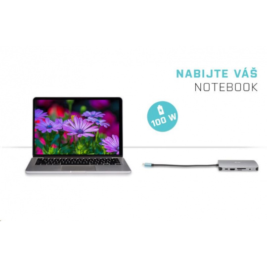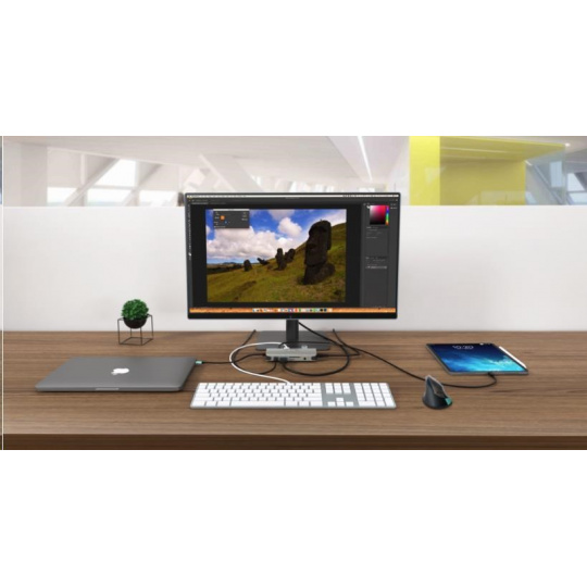 Malá kovová dokovacia stanica USB-C, ku ktorej môžete ľahko pripojiť externý monitor alebo projektor cez port HDMI alebo VGA. Stačí pripojiť notebook alebo tablet (bez potreby ovládačov) a využiť rýchle dátové pripojenie USB, pripojenie k internetu cez port LAN a možnosť pripojiť slúchadlá a mikrofón. Samozrejme, podporuje napájanie notebooku až do 100 W, čo znamená, že budete môcť nabíjať všetky notebooky a tablety, ktoré podporujú nabíjanie cez USB-C (USB-C Power Delivery).