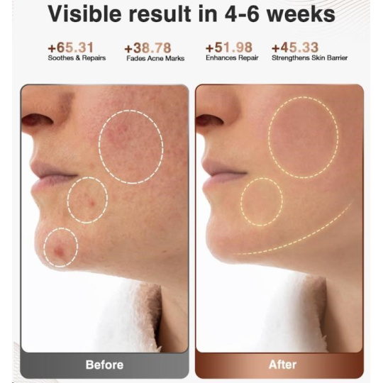- Viditeľné výsledky za 4-6 týždňov: Pravidelné používanie preukázateľne znižuje akné, vrásky, pigmentáciu a zlepšuje elasticitu pleti.