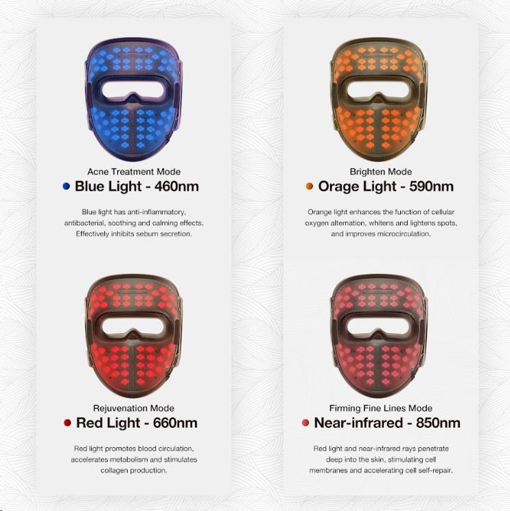 - Štyri klinicky overené vlnové dĺžky pre komplexnú starostlivosť o pleť: modrá, jantarová, červená a blízka infračervená.