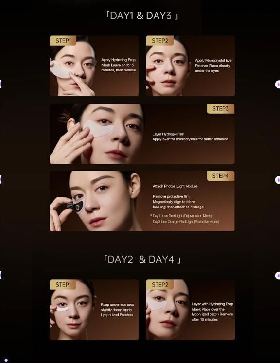Tento unikátny systém nie je len ďalší očný krém alebo maska. Je to intenzívna 4-dňová kúra, ktorá vo svojej podstate spája tri špičkové technológie: patentované transdermálne mikrokrystaly, silnú fotónovú terapiu a vysoko koncentrované aktívne látky, ktorých zloženie je inšpirované najdrahšími ošetreniami z estetických kliník. Vďaka tomu sa účinné látky dostanú až 98x efektívnejšie do hlbokých vrstiev pokožky, než je tomu u bežných produktov.
