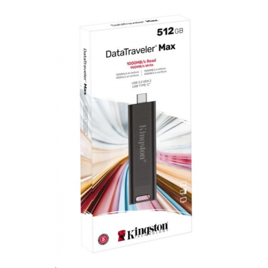 Kingston DataTraveler® Max je vysoko výkonný flash disk USB typu C®1ktorý využíva najnovší štandard USB 3.2 2. generácia pre rýchlosť čítania/zápisu záznamov do 1000/900 MB/s2. Jedinečné tvarované puzdro, navrhnuté s ohľadom na prenosnosť a pohodlie, chráni konektor, keď sa nepoužíva, a možno ho ľahko premiestniť jediným pohybom. DT Max ponúka vynikajúci výkon a rozšírenú kapacitu až do 1 TB3, čo z neho robí ideálne riešenie na prenos a ukladanie veľkých digitálnych súborov, ako sú fotografie v rozlíšení HD, videá v rozlíšení 4K/8K, hudba a ďalšie.