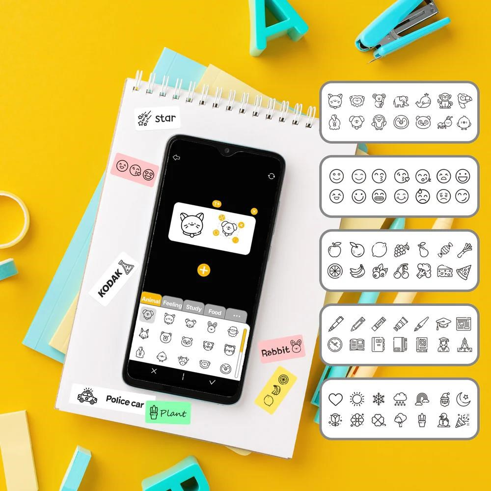 Návrh štítkov s textom a emotikónmi v aplikácii KODAK MEMO. Pripojte sa cez Bluetooth a tlačte si vlastné štítky kedykoľvek a kdekoľvek.