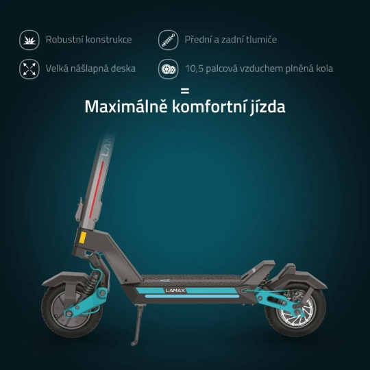 To nie je obyčajná jazda, pri tejto takmer lietaš, pretože každá časť kolobežky je do detailu premyslená. Už len veľké 10,5“ vzduchom plnené kolesá s?extra vyztuženým plášťom odolným voči defektom zaručujú pohodlnú jazdu aj po dlažobných kockách, a perfektnú stabilitu a priľnavosť, ktorú oceníš najmä pri brzdení, ale aj v zákrutách. Jazdný komfort ešte podporuje predné aj zadné odpruženie spolu s vyztuženým zadným blatníkom, ktorý nevydáva rušivé zvuky. Ešte dôležitejšie je bezpečnosť, o ktorú je postarané vďaka ochrane proti nechcenému rozjazdu, čo znamená, že elektromotor sa aktivuje až po dosiahnutí určitej rýchlosti. Samozrejmosťou je aj trojitý brzdný systém, kde kvalitné zadné a predné kotúčové brzdy spolu s elektronickou brzdou skracujú brzdnú vzdialenosť. Dokonalý pôžitok z jazdy umocňujú rozšírené riadidlá, ktoré spolu s dostatočne širokou a dlhšou nášľapnou platňou poskytujú dokonalú jazdnú stabilitu a bezpečnosť.