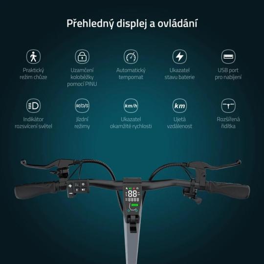 Veľký displej prehľadne zobrazuje všetky potrebné údaje, rýchlosť, prejdenú vzdialenosť, stav batérie, zvolený režim či stav svetiel. Čitateľný je za akýchkoľvek podmienok aj v noci.