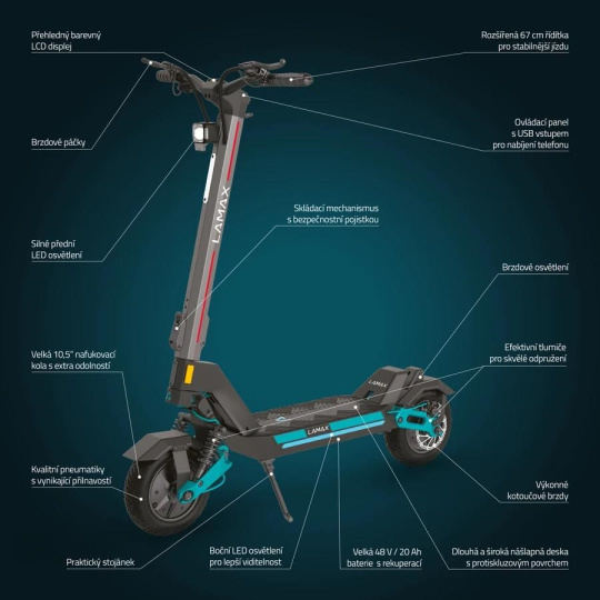 Všetky údaje o jazde uvidíš za každého počasia alebo pokojne aj v noci na veľkom LCD displeji, určite ti preto neunikne, koľko šťavy zostáva alebo akú máš rýchlosť. Hravo cez neho kolobežku pomocou 3-miestneho PIN kódu aj zabezpečíš proti krádeži. Sú úseky, kde sa môžeš tešiť okolím a neriešiť rýchlosť, tú hlídka tempomat. Keď je rýchlosť konštantná, automaticky sa aktivuje. Bezpečnú jazdu za akýchkoľvek podmienok podporuje LED osvetlenie celej kolobežky, kedy vďaka LED svetlu, bočným farebným svetlám a zadnému integrovanému budeš neprehladnuteľný. Keď ide s tebou kamoš a kecáte alebo sa ti nechce do prudkého kopca kolobežku tlačiť, aktivuj Walking Mode, ktorý popojazdí pomalým tempom max. 6 km/h. Kolobežka ťa zachráni aj vtedy, keď máš vybitý mobil, stačí využiť USB vstup na nabíjanie. Ak potrebuješ svoju mašinu preniesť alebo uložiť, počas 3 sekúnd ju pomocou inovatívneho mechanizmu zložíš. Len počítaj s tým, že váži 35 kg.