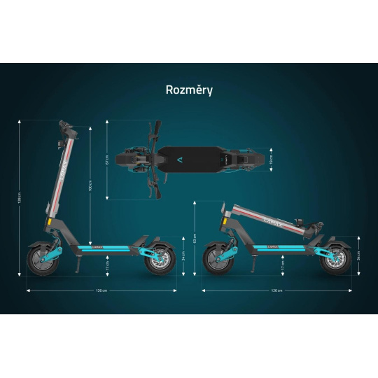 Rozmery (zložená): 126 × 67 × 63 cm (dĺžka, šírka, výška)