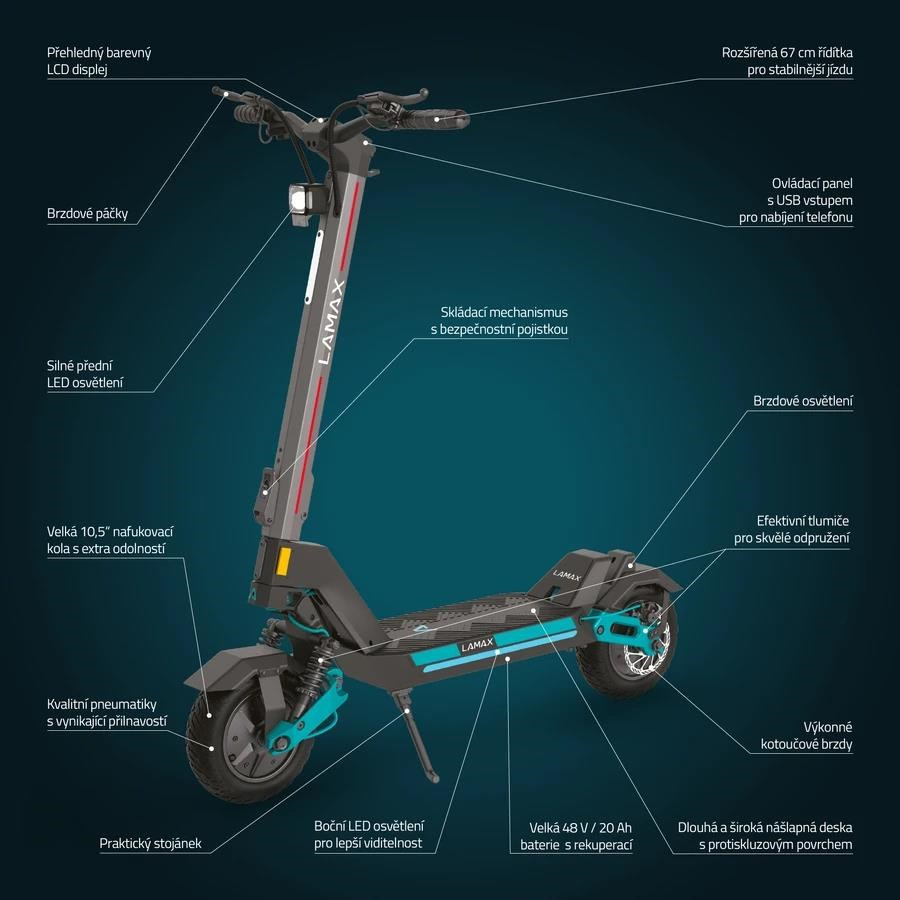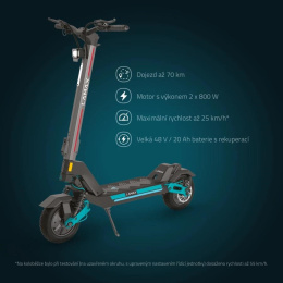 Záleží len na tom, či sa prepletáš mestským labyrintom alebo brázdiš náročnejší terén, LAMAX eTank SA70 ťa všade podrží. Jej telo v modernom industriálnom dizajne je pevné, stabilné a odolné. V každom detaile vidíš dokonalú kvalitu spracovania. Kolobežka unesie až 150 kg záťaže, a to bez problémov aj do kopca vďaka silným motorom o výkone 2×800 W. Môžeš ale zvoliť medzi 2 výkonnostnými režimami, úsporný využíva motory len na 60 %, i tak sa parádne prejdeš, alebo to rozbehni naplno. Pri jazde z kopca alebo brzdení rekuperácie vracia šťavu späť do vysokokapacitnej lítiovej batérie 48 V/20 Ah, ktorá je vybavená BMS inteligentným systémom, ktorý ju chráni pred prehrievaním alebo napríklad podbitím. Dojazd je tak ideálnych podmienkach až 70 km. Na výber máš zo 4 rýchlostných stupňov, pričom maximálka činí 25 km/h, čo už pekne sviští a po meste je to ideál.