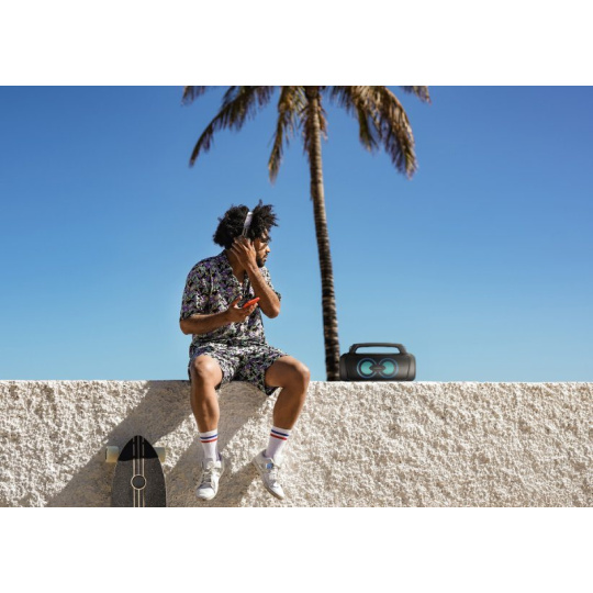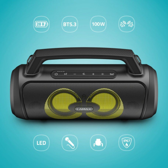 Malé telo s veľkým výkonomRozbehni kdekoľvek aj neplánovanú párty vo veľkom štýle. Prenosný párty reproduktor LAMAX PartyGo1 je vzhľadom malý, ale ukrýva v sebe veľkú silu, výkon 100 W. Technológia BeatBass® mu dáva silný, plný a bohatý zvuk. Grilovačku, narodeninovú oslavu alebo menšie párty oživia 3 režimy LED podsvietenia a možnosť pripojenia mikrofónu, keď si chceš užiť karaoke alebo akciu moderovať. Reprak sa automaticky spáruje s akýmkoľvek zariadením prostredníctvom Bluetooth 5.3, ktorý poskytuje bezchybný prenos až na 18 m. Na pohodu s tebou bude nový parťák aj cestovať, batéria mu vydrží až 20 hodín a má navyše šikovné madlo alebo popruh cez rameno. Pripojíš ho ako cez BT, tak USB, microSD, prípadne AUX a vie sa premeniť aj v powerbanku cez USB-A vstup. A keď jeden reprák nestačí, môžeš ho spárovať s druhým.