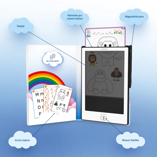 Veľká plocha tabuľky ponúka množstvo miesta na kreslenie aj zapisovanie nápadov, a pritom zostáva šetrná k detským očiam. Displej nebliká, nevyžaruje modré svetlo a nenamáha zrak ani pri dlhšom používaní. Celý set, tabuľka aj šablóny, je navyše uložený v praktickom obale v tvare knižky, vďaka ktorému zostane všetko pekne pohromade a deti si tak môžu vziať zábavu kamkoľvek so sebou.