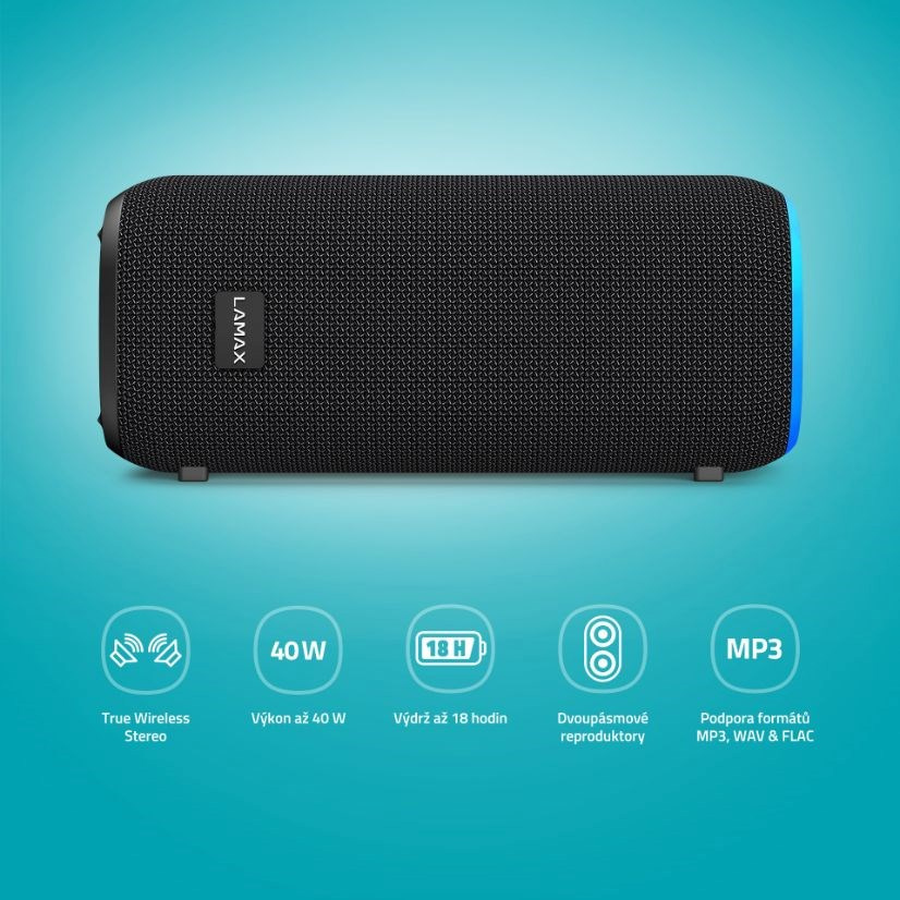 Hneď ako vyberieš LAMAX StarCube1 z tašky, je jasné, že na scénu vstúpila hviezda večierkov. Nie je to žiadny obor, skôr moderný elegán so štýlom. Jeho horizontálny mobilný dizajn zaujme na prvý pohľad, a keď rozohrá svoje 4 nastaviteľné LED efekty a rozbalí to na plný výkon 40 W, je to jazda. A bude dlhá, batéria vydrží až 18 hodín. Keď dochádza šťava, pripoj kábel USB-C. Ak to chceš naozaj roztočiť, pripoj ďalší reprák rovnakého typu pomocou funkcie TWS a budeš počuť ten hukot. Dvojpásmové reproduktory burácajú čistým a vyváženým zvukom, v ktorom vyniknú bohaté basy a jasné výšky. Po zapnutí Bluetooth 5.3 sa reproduktor automaticky spáruje s najrôznejšími zariadeniami a rovnako ľahko sa aj ovláda. Široká škála pripojení vrátane microSD a podporovaných formátov je už samozrejmosťou.