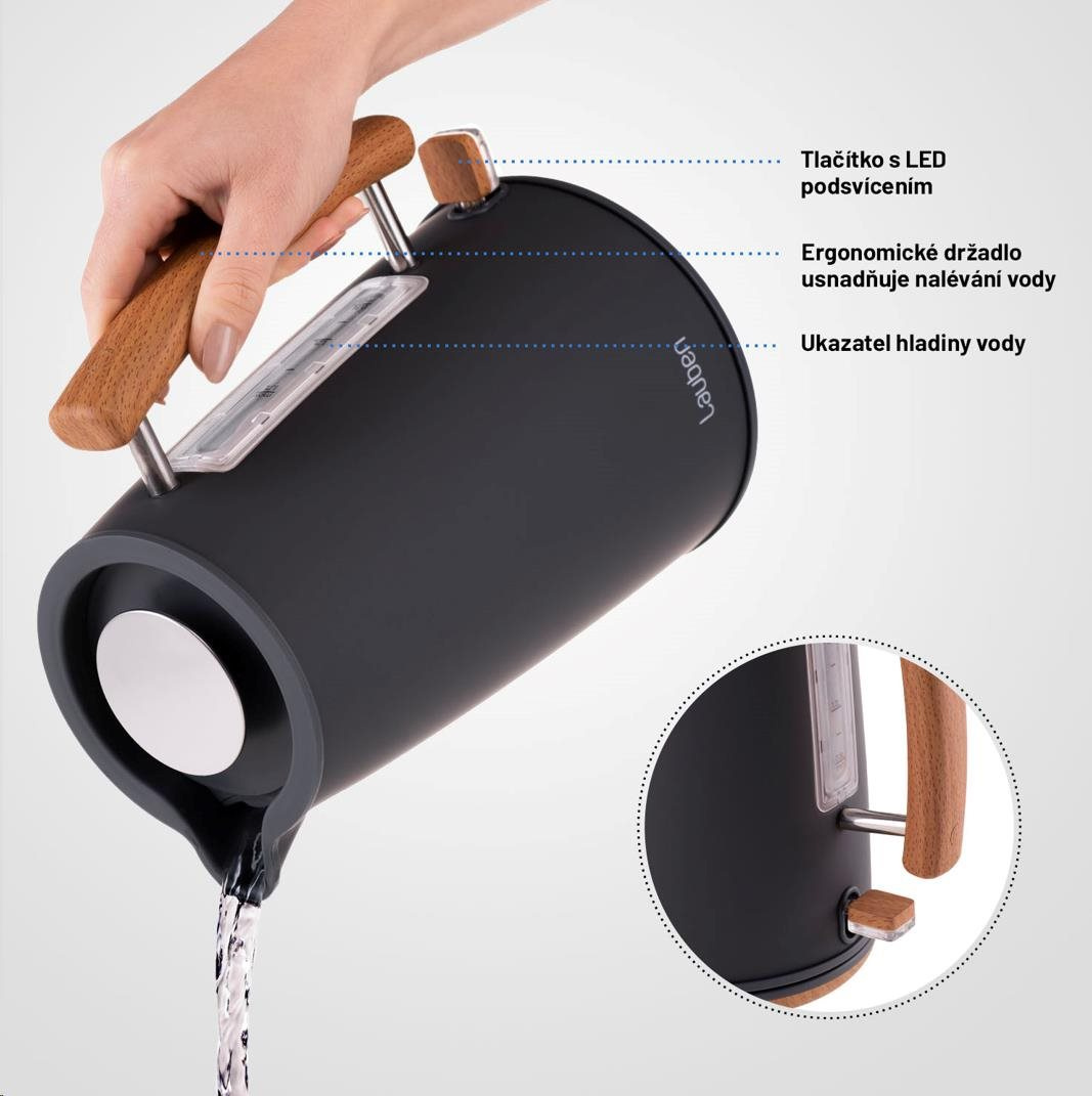 Aj medzi rýchlovarnými konvicami nájdete tú, ktorá dodá vašej kuchyni punc štýlu a originality. Konvica Lauben je navrhnutá v minimalistickom a vkusnom severskom dizajne, ktorý sa bude vo vašej kuchyni vynímať. Telo konvice je vyrobené z #304 nerezovej ocele. Pogumovaný povrch konvice v kombinácii s rukoväťou v drevenom dekore vyzerá na linke štýlovo. Hlavný vypínač konvice disponuje LED podsvietením.