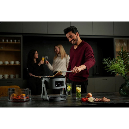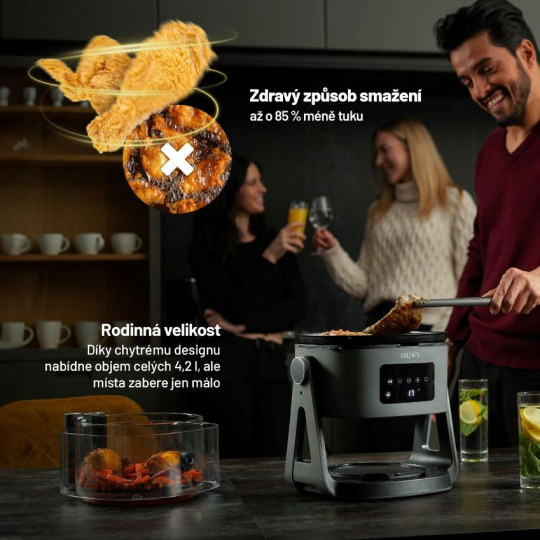 Horkovzdušná fritovacia rúra s grilom vďaka vysokorýchlostnej 360° cirkulácii vzduchu ušetrí čas strávený v kuchyni, energiu aj zdravie. Naháňa vašu cestu k lepšiemu životnému štýlu, pretože obľúbené vyprážané jedlá pripraví s využitím až o 80 % menšieho množstva tuku. Rovnomerné prepečenie dosahujú jedlá prenikaním infračerveného svetla. Ešte viac možnosti prípravy jedál poskytuje unikátna technológia umožňujúca otáčanie hornej časti o 180°, a to najmä v spojení s grilovacou a hlbokou panvicou, ktoré sú súčasťou balenia.