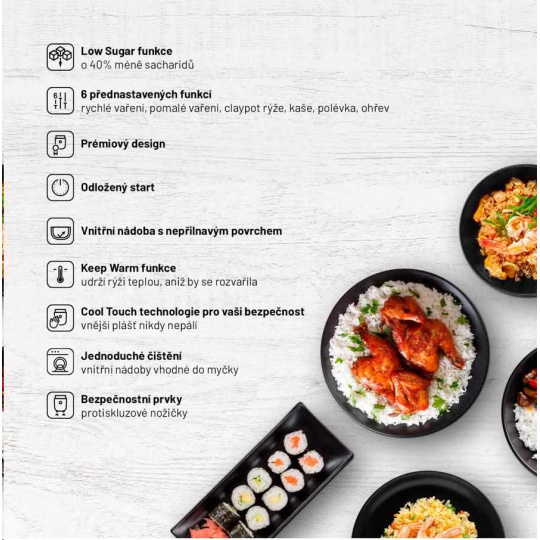 Rýža s až o 40 % nižším obsahom sacharidovLauben Low Sugar Rice Cooker je viacúčelový prémiový ryžovar s funkciou low sugar, pri ktorej vďaka špeciálnej technológii varenia dôjde k separácii sacharidov. S týmto pomocníkom dosiahnete dokonalosť všetkých druhov ryže a vďaka 6 nastaviteľným režimom rýchlo vytvoríte zdravé a chutné jedlá aj z ďalších surovín. S ryžovarom Lauben pripravíte strukoviny, polievku alebo napríklad bez toho, aby ste zapli sporák.