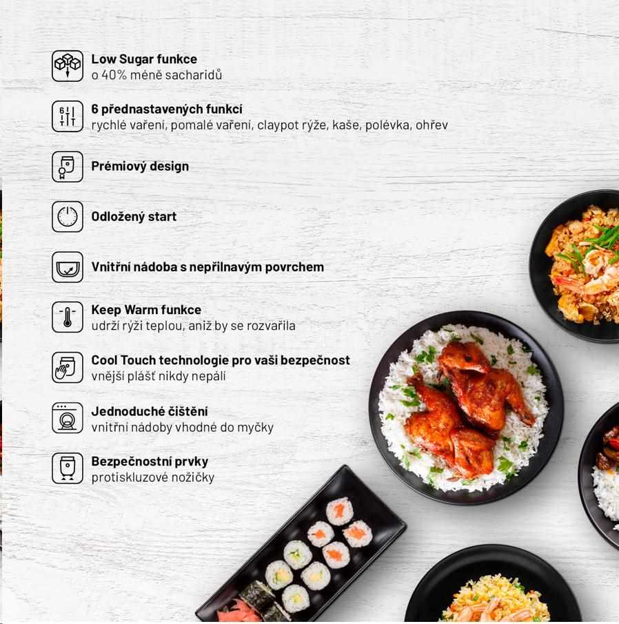 Rýža s až o 40 % nižším obsahom sacharidovLauben Low Sugar Rice Cooker je viacúčelový prémiový ryžovar s funkciou low sugar, pri ktorej vďaka špeciálnej technológii varenia dôjde k separácii sacharidov. S týmto pomocníkom dosiahnete dokonalosť všetkých druhov ryže a vďaka 6 nastaviteľným režimom rýchlo vytvoríte zdravé a chutné jedlá aj z ďalších surovín. S ryžovarom Lauben pripravíte strukoviny, polievku alebo napríklad bez toho, aby ste zapli sporák.