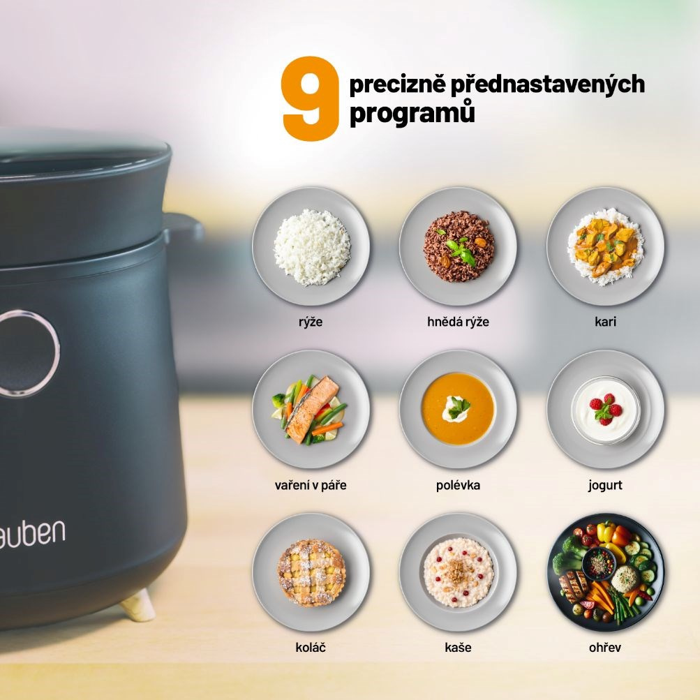 Užívajte si viac času na iné aktivity a varenie zverte multifunkčnému rýžovaču, ktorého 9 prednastavených programov si poradí s prípravou najrôznejších pokrmov. Programy ako ryža, hnedá ryža, polievka, kaša, zákusok, jogurt, kari, varenie v pare alebo ohrev sú zárukou snadného a rýchleho varenia. Prémiový keramický povrch vnútorného hrnca navyše neuvoľňuje žiadnu nežiaducu pachute ani arómu, príprava pokrmov je tak zdravšia. Ak chcete svoj životný štýl ešte vylepšiť, využite nerezový parník na dusenie v pare. Parník je navrhnutý tak, že šťavy z pripravovaného jedla nekvapú do ryže pod ním.